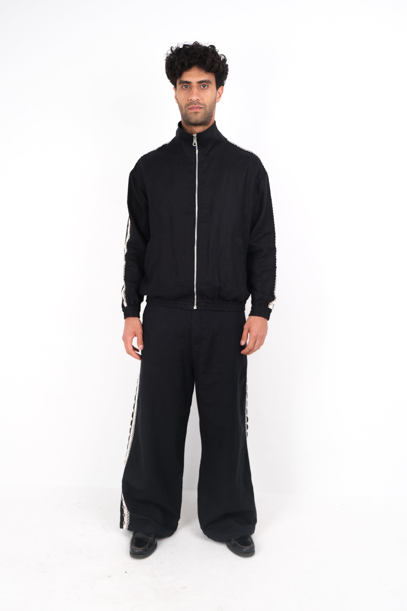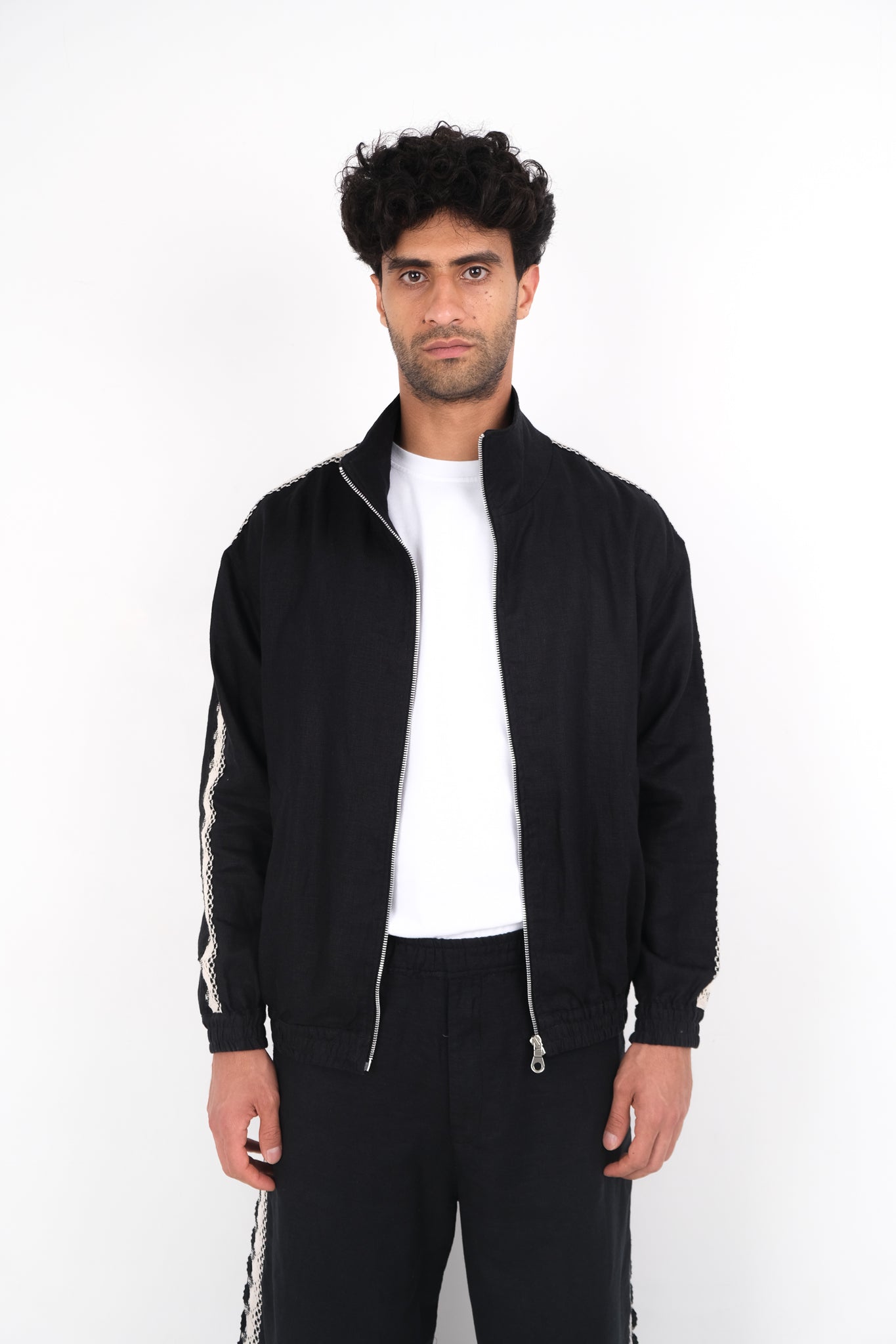 The Crochet trim track jacket made of drapey, soft linen and features a relexed fit, elasticated cuffs and waistband and two front welt pockets. Crochet trim detailing down the side.